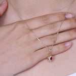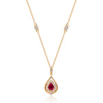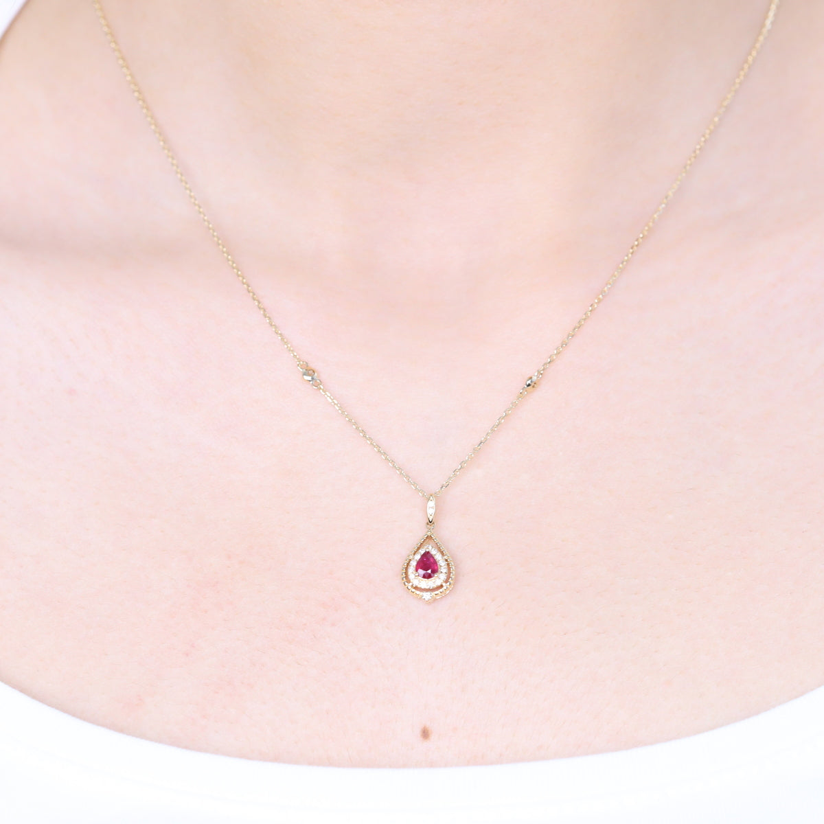 Stunning, timeless and classy eternity Unique Pendant. Decorate yourself in luxury with this Gin & Grace Pendant. This Pendant is made up of Pear-Cut Prong Setting Genuine Mozambique Ruby (1 pc) 0.35 Carat and Round-Cut Prong Setting Natural Diamond (20 pcs) 0.16 Carat accent stones for a lovely design. This pendant is weight 2.52 grams. The pendant is crafted of shining 14-karat Yellow Gold and is completed by a highly polished finish.