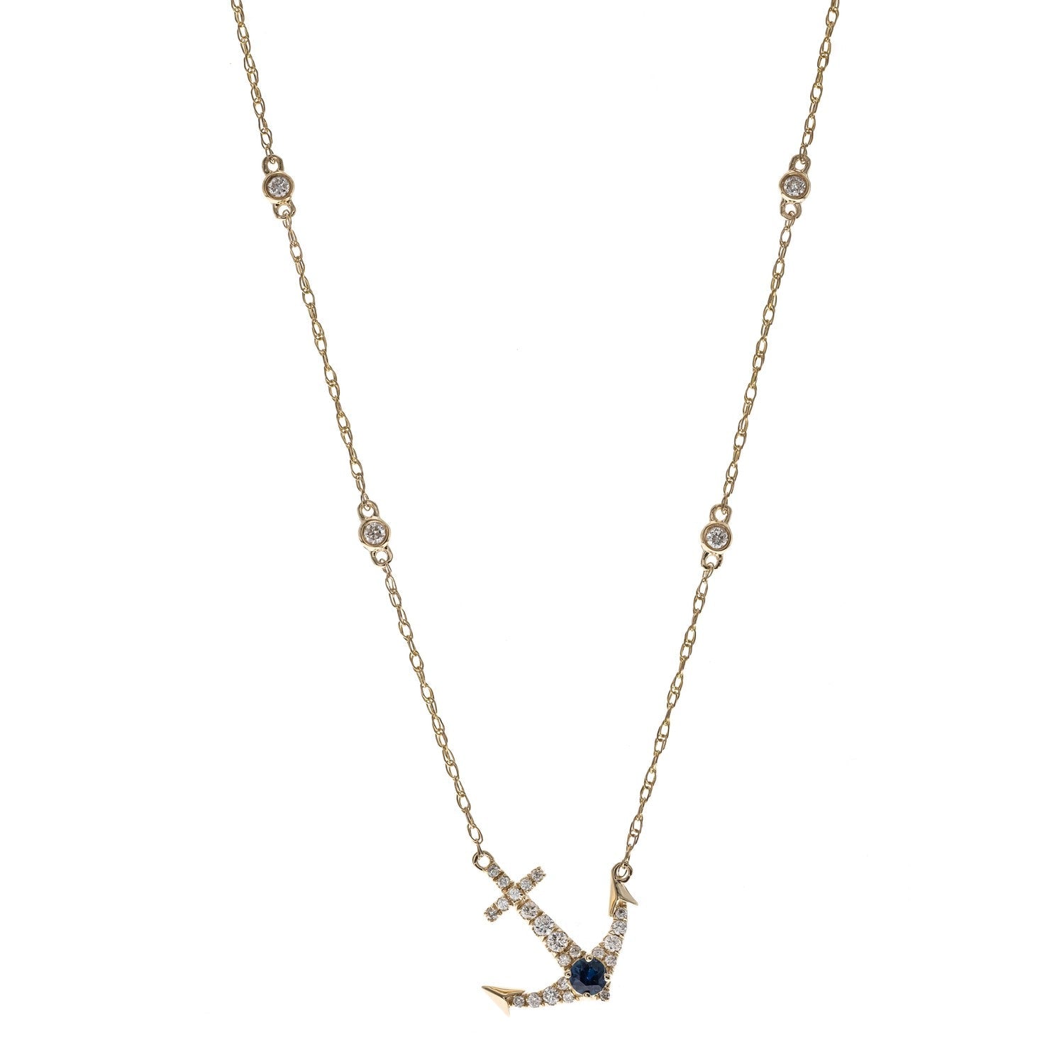 Decorate yourself in elegance with this Necklace is crafted from 10K Yellow Gold by Gin & Grace. This Necklace is made up of Round-Cut Blue Sapphire (1 pcs) 0.13 carat and Round-cut White Diamond (27 Pcs) 0.25 Carat. This Necklace is weight 1.80 grams. This delicate Necklace is polished to a high finish shine.