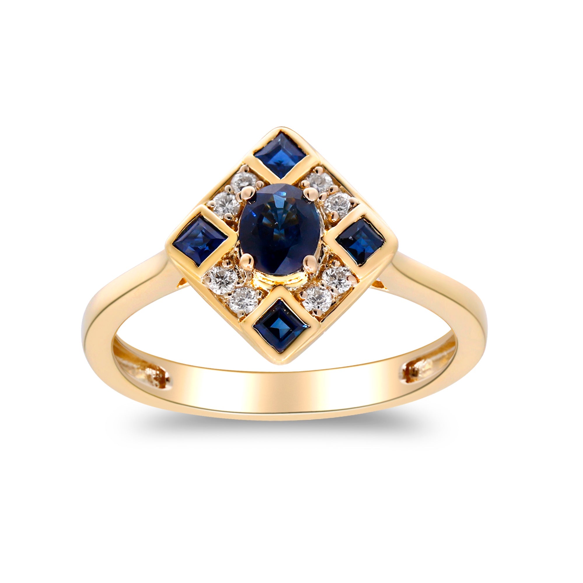 Decorate yourself in elegance with this Ring is crafted from 10-karat Yellow Gold by Gin & Grace. This Ring is made up of 5x4 mm Oval-Cut Ceylon Blue Sapphire (1 pcs) 0.38 carat, 2.0 mm Square-cut Blue Sapphire (4 pcs) 0.25 carat and Round-cut White Diamond (8 Pcs) 0.10 Carat. This Ring is weight 2.15 grams. This delicate Ring is polished to a high finish shine.