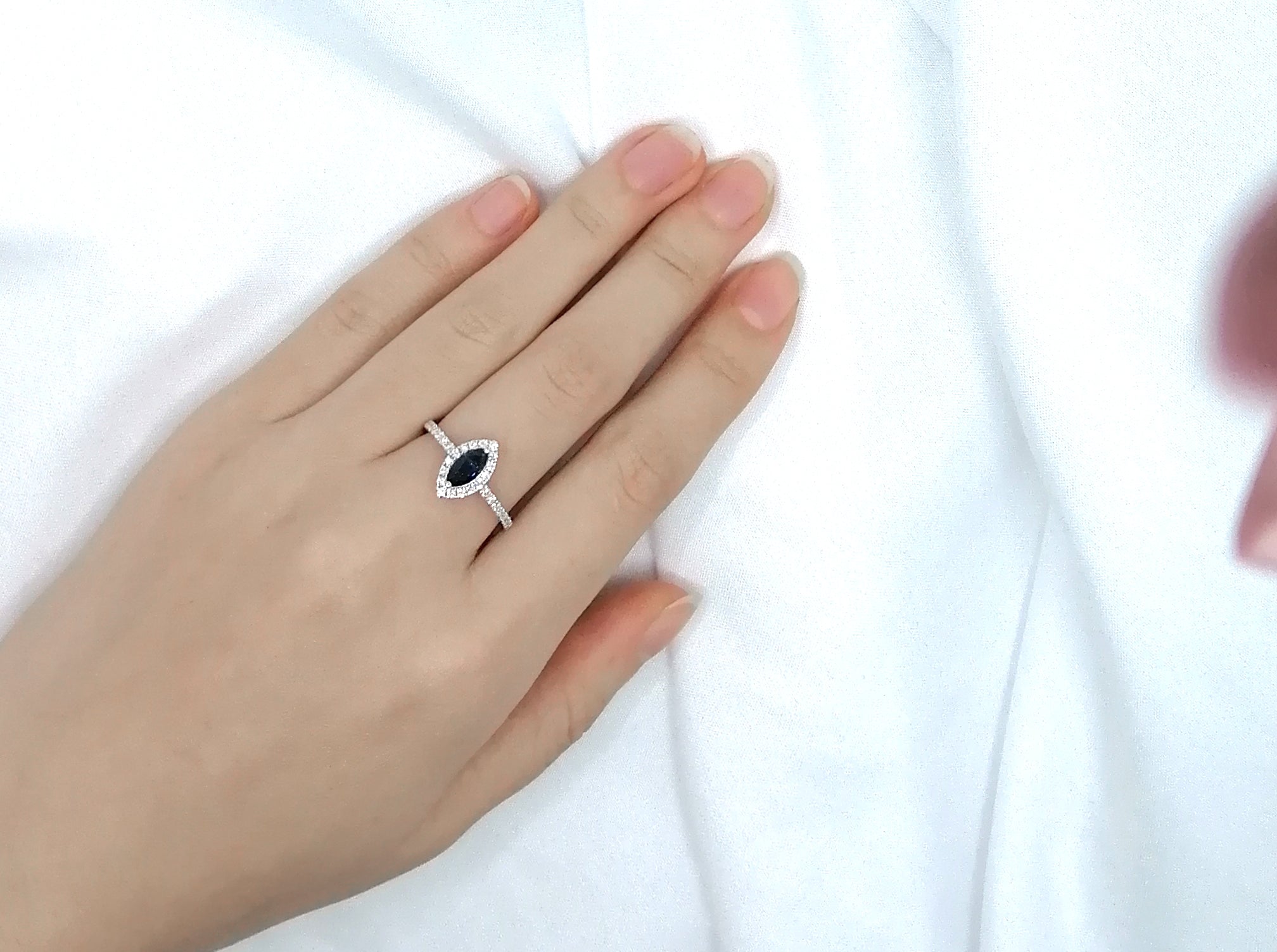 Decorate yourself in elegance with this Ring crafted from 14-karat White Gold by Gin & Grace. This Ring is made up of 4x8 mm Marquise-Cut Ceylon Blue Sapphire (1 pcs) 0.69 carat and Round-cut White Diamond (30 Pcs) 0.34 Carat. This Ring weighs 1.93 grams. This delicate Ring is polished to a high finish shine.