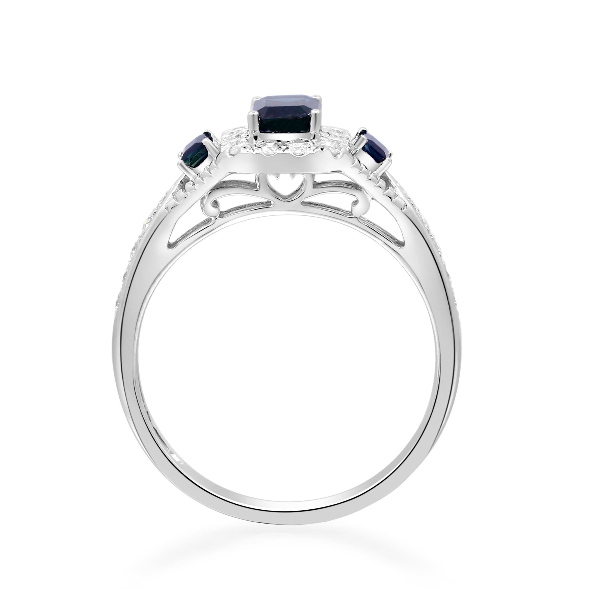 Stunning, timeless and classy eternity Unique Ring. Decorate yourself in luxury with this Gin & Grace Ring. The 10K White Gold jewelry boasts Emerald-Cut Prong Setting Natural Blue Sapphire (3 pc) 0.86 Carat, along with Natural Round cut white Diamond (24 Pcs) 0.34 Carat, accent stones for a lovely design. This Ring is weight 2.10 grams. Crafted with 10K White Gold, this delicate Ring is polished to a high finish shine.