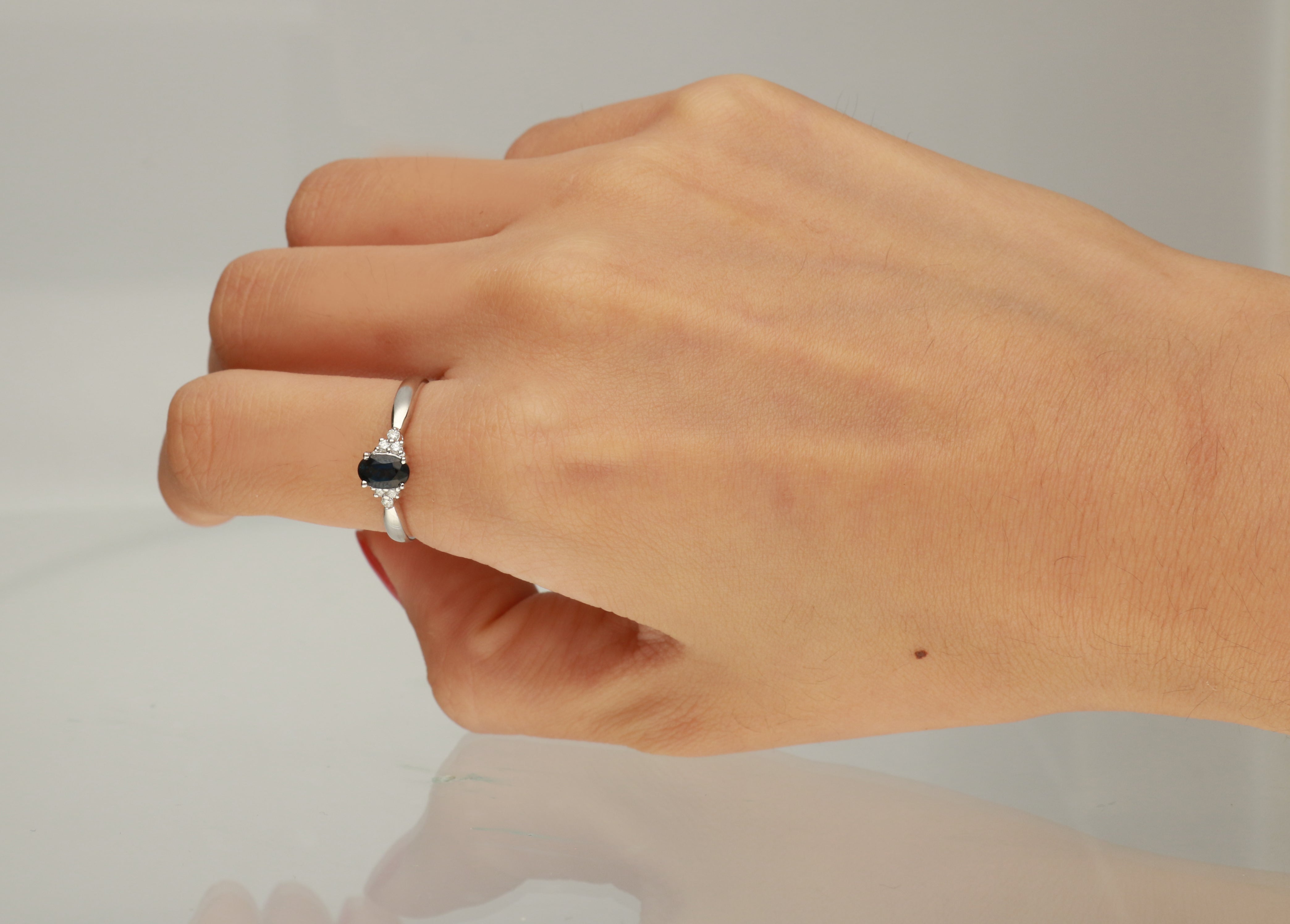 Decorate yourself in elegance with this Ring is crafted from 10K White Gold by Gin & Grace. This Ring is made up of Oval-Cut blue sapphire (1 Pcs) 0.62 carat and round-cut White Diamond (6 pcs) 0.07 carat. This Ring is weight 1.92 grams. This delicate Ring is polished to a high finish shine.