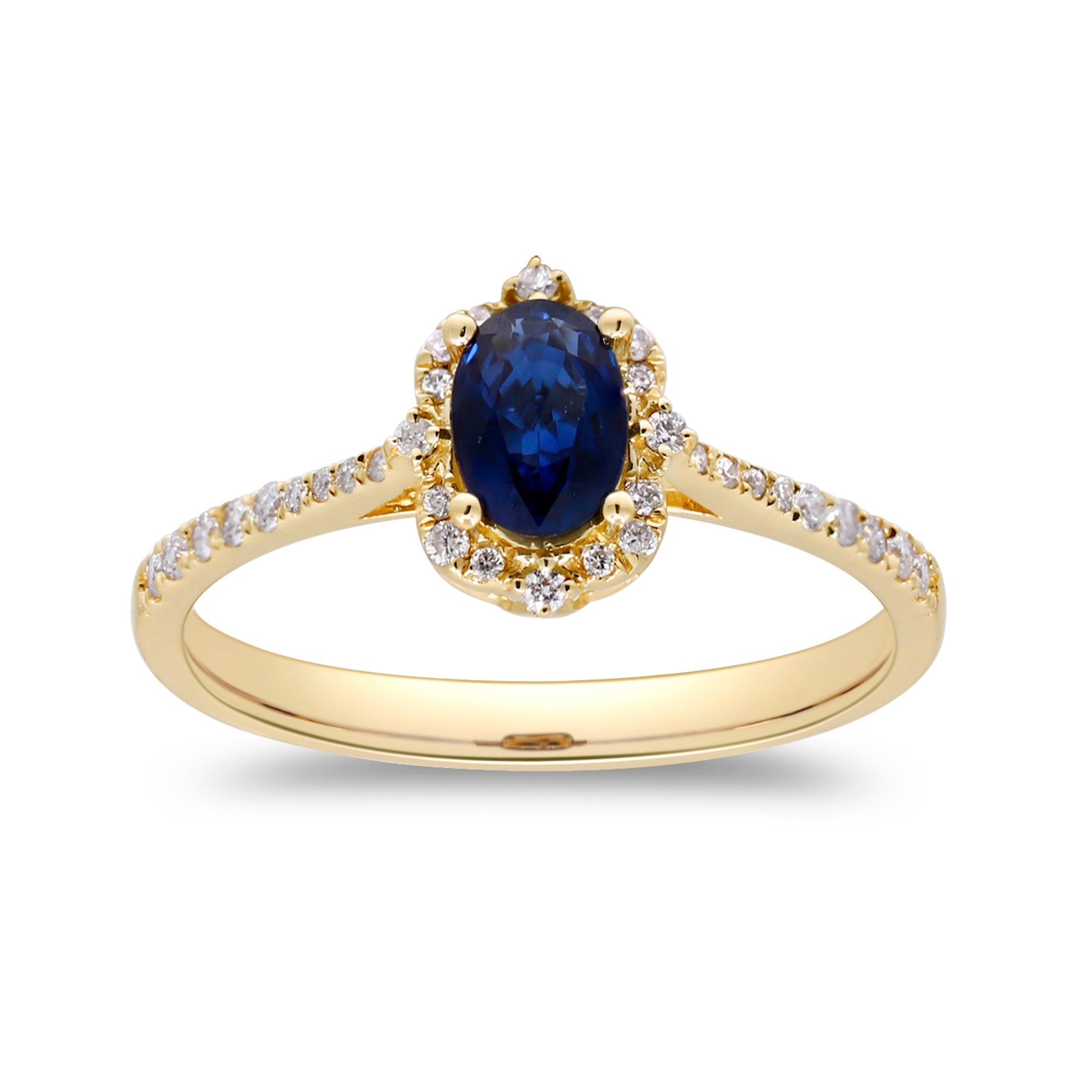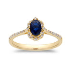 Decorate yourself in elegance with this Ring is crafted from 10-karat yellow Gold by Gin & Grace. This Ring is made up of Oval-Cut Blue sapphire (1 Pcs) 0.59 carat and round-cut white diamond (34 pcs) 0.16 carat. This Ring is weight 1.77 grams. This delicate Ring is polished to a high finish shine.