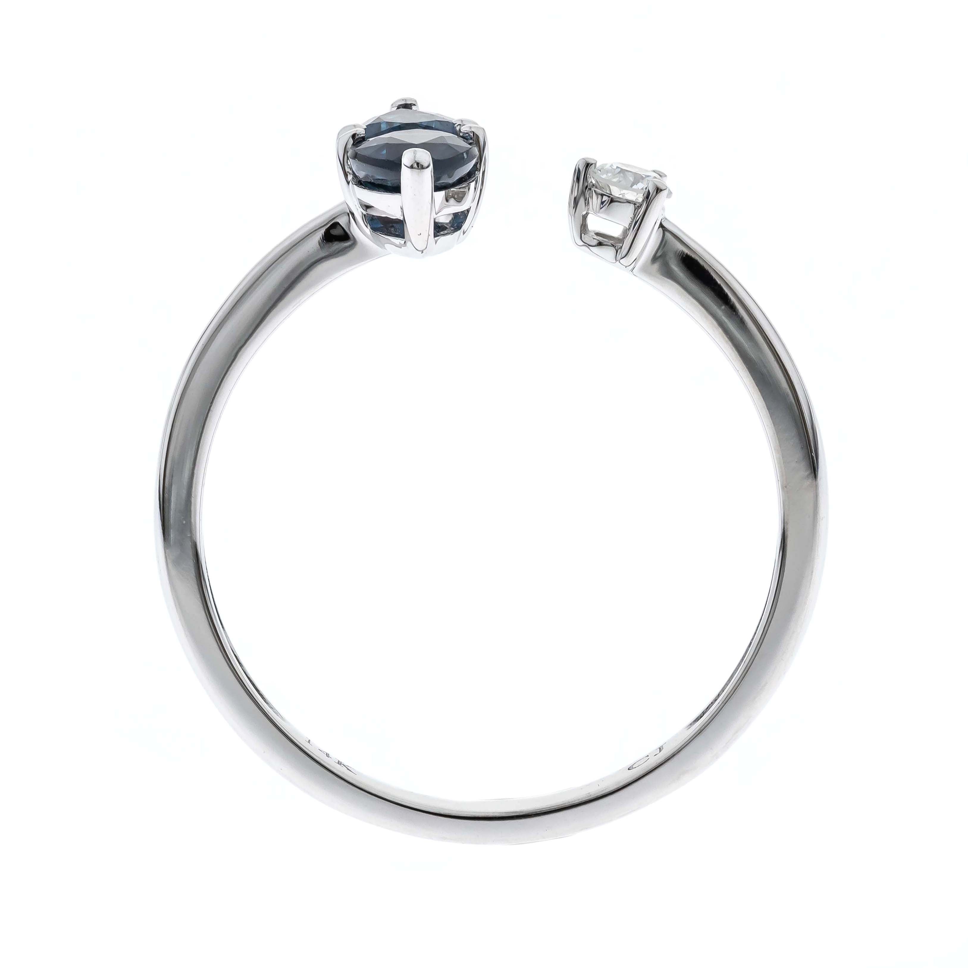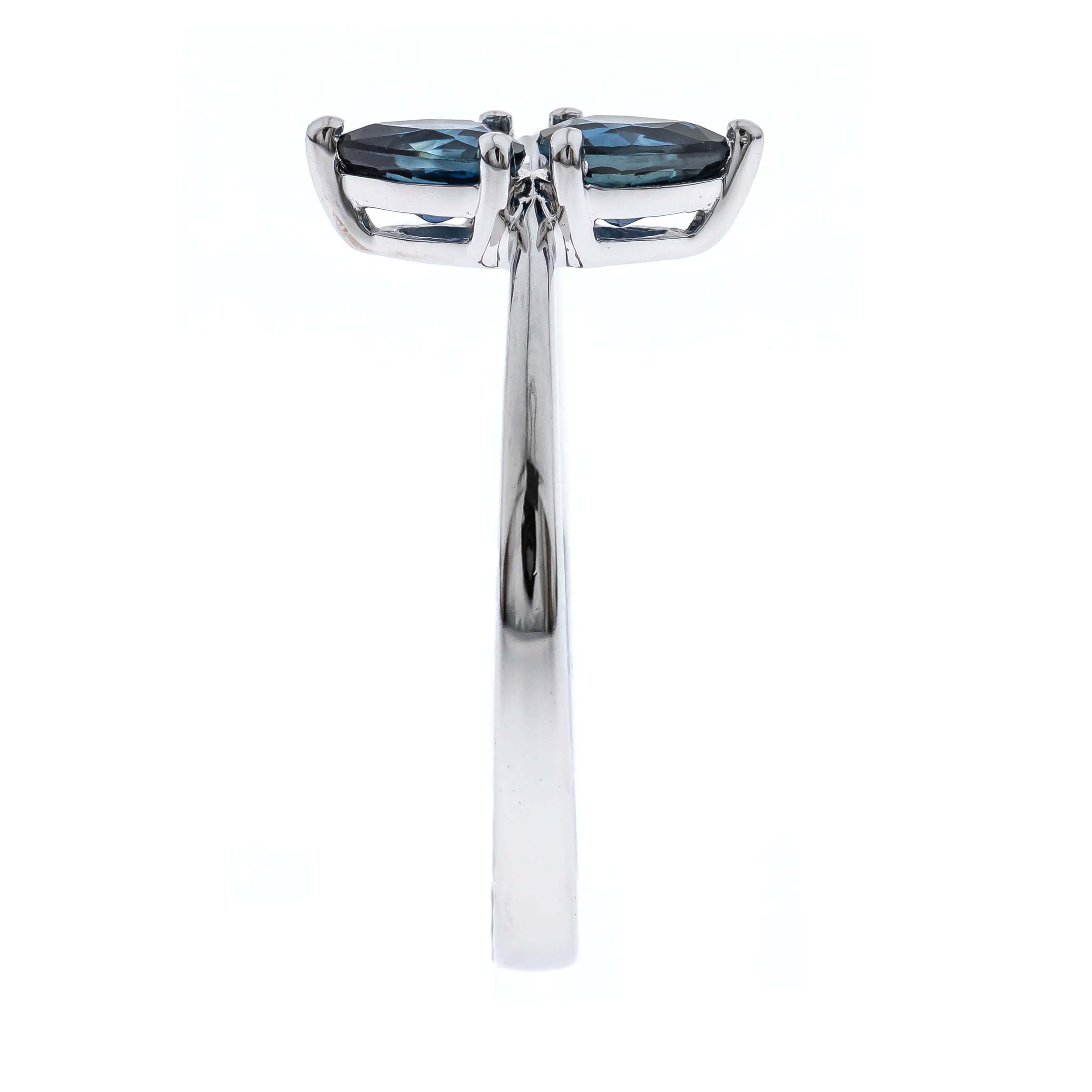 Stunning, timeless and classy eternity Unique Ring. Decorate yourself in luxury with this Gin & Grace Ring. The 14k White Gold jewelry boasts Pear-Cut Prong Setting Genuine Ceylon Blue Sapphire (2 pcs) 0.83 Carat, along with Natural Round cut white Diamond (1 Pc) 0.07 Carat, accent stones for a lovely design. This Ring is weight 2.08 grams. Crafted with 14k White Gold, this delicate Ring is polished to a high finish shine.