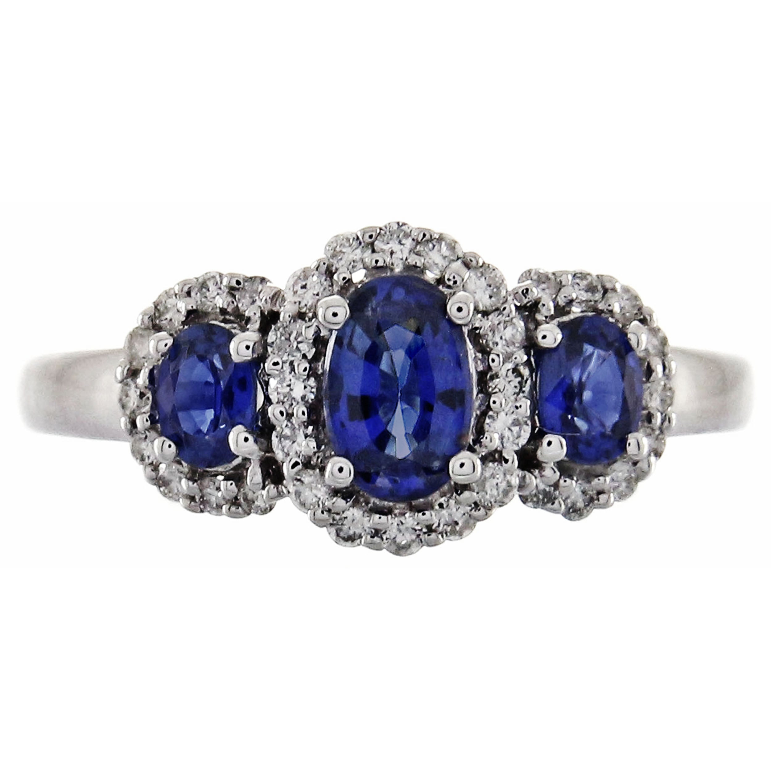 Decorate yourself in elegance with this Ring is crafted from 14 White Gold by Gin & Grace. This Ring is made up of Oval-Cut (1 pcs) 0.67 carat, Oval-cut (2 pcs) 0.52 carat Ceylon Blue Sapphire and Round-cut White Diamond (34 Pcs) 0.26 Carat. This Ring is weight 3.21 grams. This delicate Ring is polished to a high finish shine.
