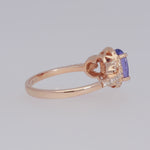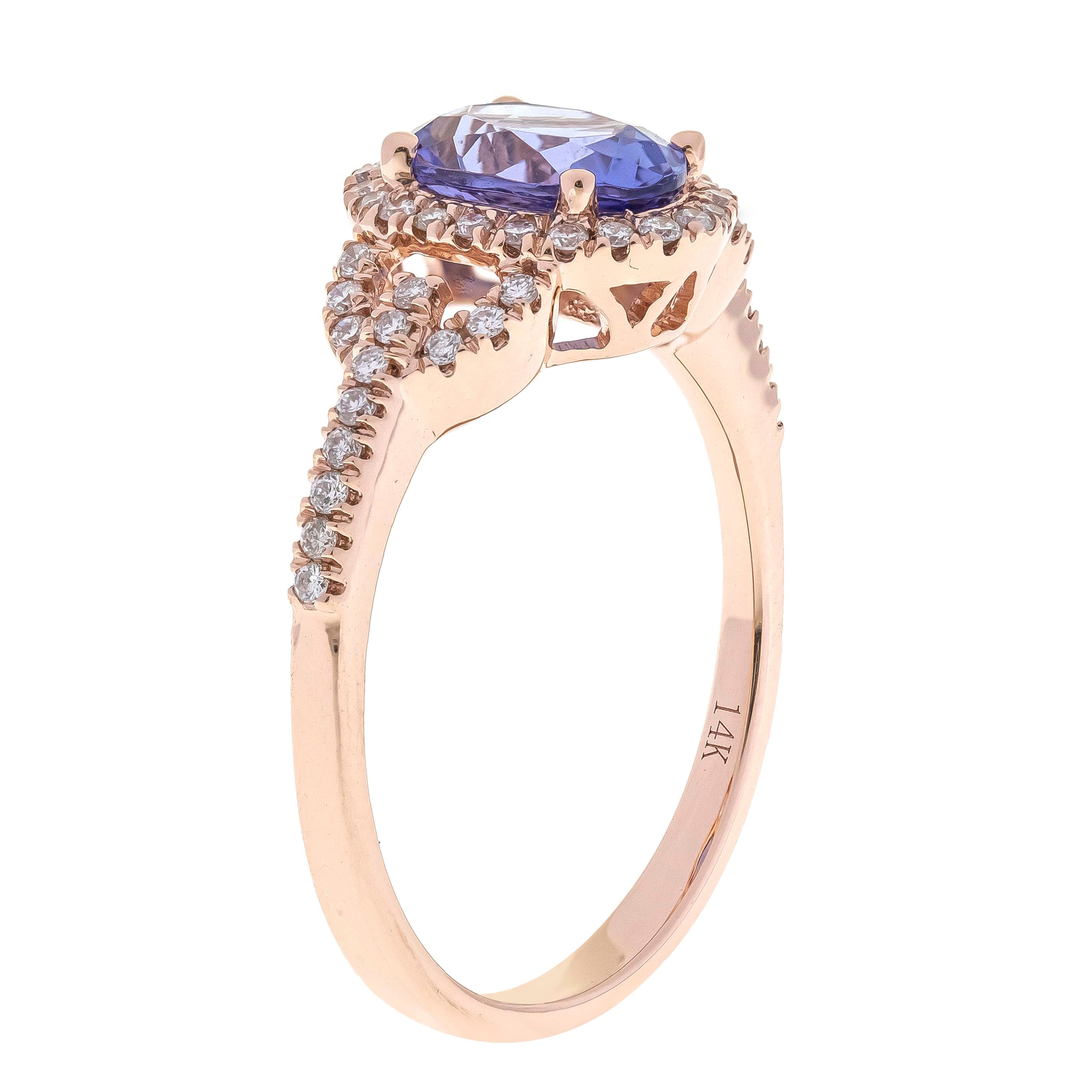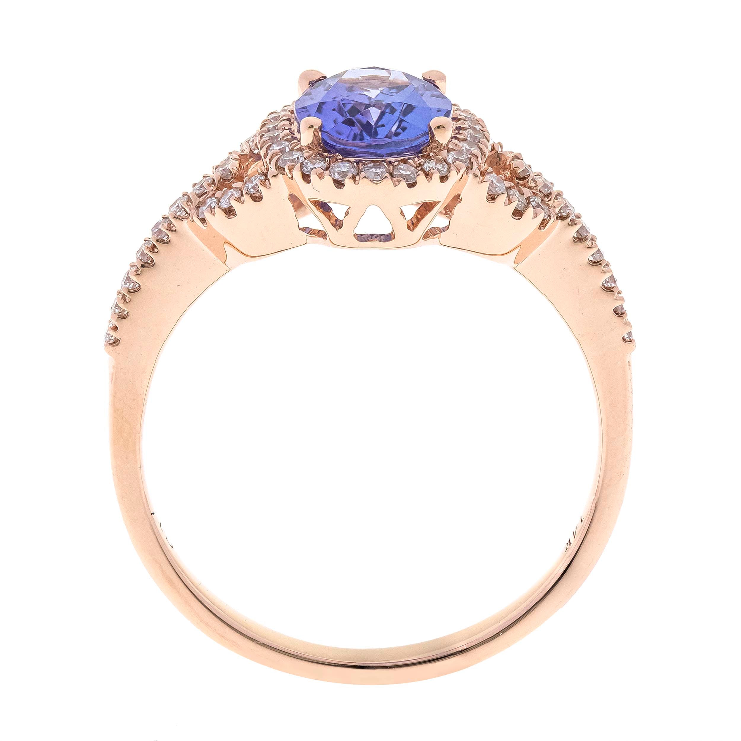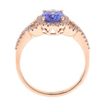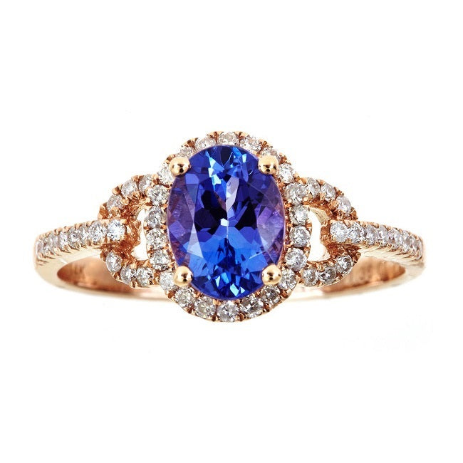 Gin & Grace Enchanting and classic, this ring is crafted from 14-karat rose gold. The top of the slightly tapered band is encrusted with round cut white diamonds. Half circle Loupes, covered with white diamonds, extend from the sides of the main setting, attaching the center stone to the band. The main setting features an oval cut tanzanite, haloed by round cut white diamonds, giving this ring its timeless and sophisticated look. Tanzanite Gemstone colors: Blue Gemstone: Tanzanite: One (1) Tanzanite setting: prong Tanzanite cut: Oval Tanzanite measures: 6 mm wide x 8 mm long Gemstone weight: 1.22 carats White diamonds Diamonds:50 Diamond cut: Round Diamond measurements: Each measures 1 mm Diamond weight: 0.25 carat Color: G-H Clarity: I1-I2 Setting: Prong Metal information and dimensions Metal: 14K Rose gold Finish: High polish Metal weight: 2.64 grams Ring setting dimensions: 18mm wide x 22 mm long x 2 mm deep Band dimensions: 2 mm wide
