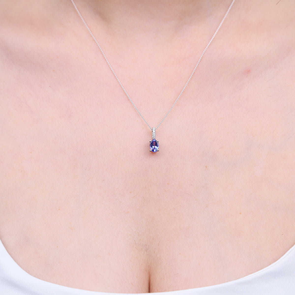 Decorate yourself in elegance with this Pendant is crafted from 10-karat White Gold by Gin & Grace Pendant. This Pendant is made up of 6X8 Oval-Cut Prong setting Genuine Tanzanian Tanzanite (1 Pcs) 0.98 Carat and Round-Cut Prong setting Natural White Diamond (6 Pcs) 0.04 Carat. This Pendant is weight 1.27 grams. The gorgeous Pendant hangs from a 18-inch wheat chain. This delicate Pendant is polished to a high finish shine.