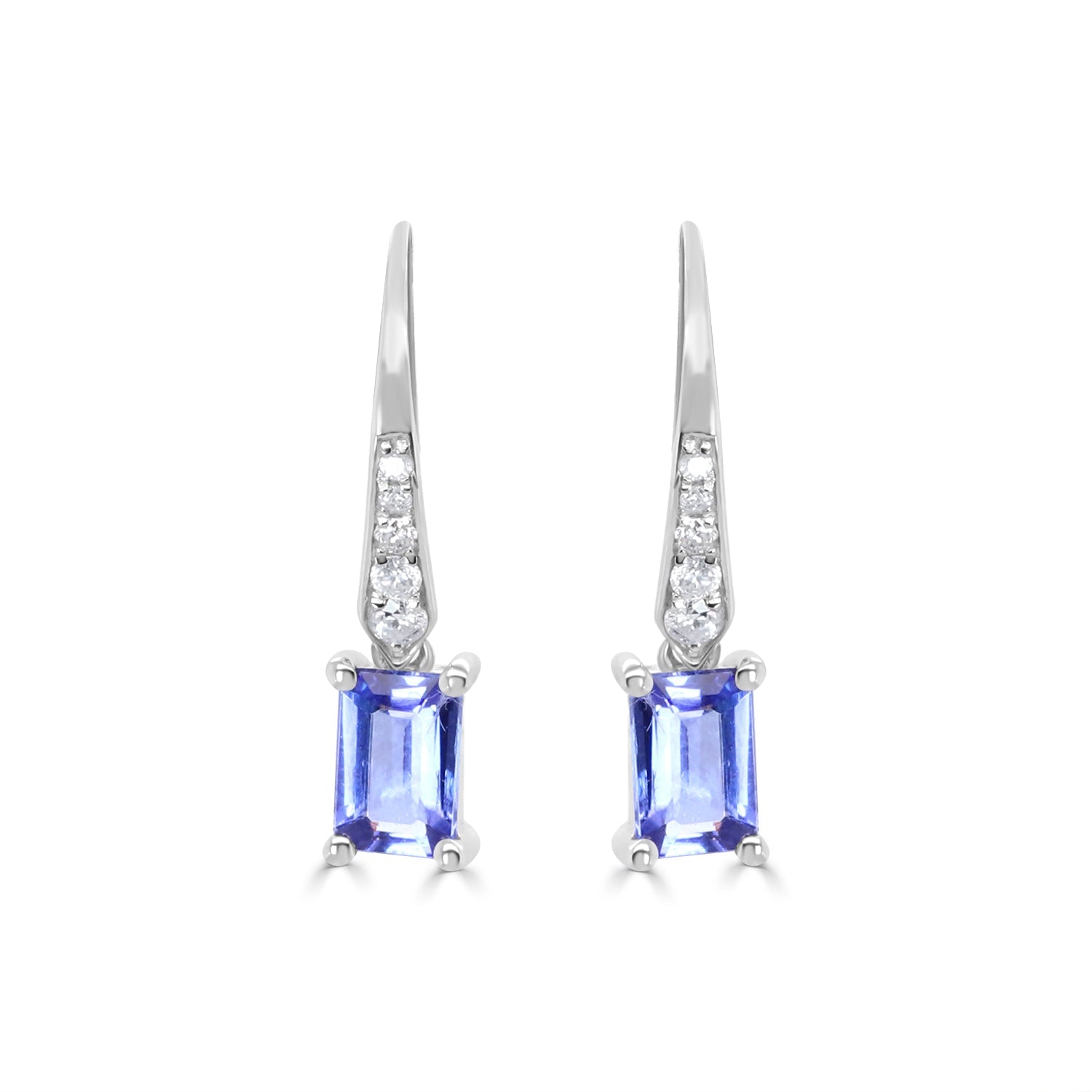 Decorate yourself in elegance with this Earring is crafted from 14-karat White Gold by Gin & Grace Earring. This Earring is made up of 4*6MM Tanzanian Tanzanite emerald-cut (2 Pcs) 1.22 Carat Round-Cut Prong setting White Diamond (10 Pcs) 0.13 Carat. This Earring is weight 1.47 grams. This delicate Earring is polished to a high finish shine.