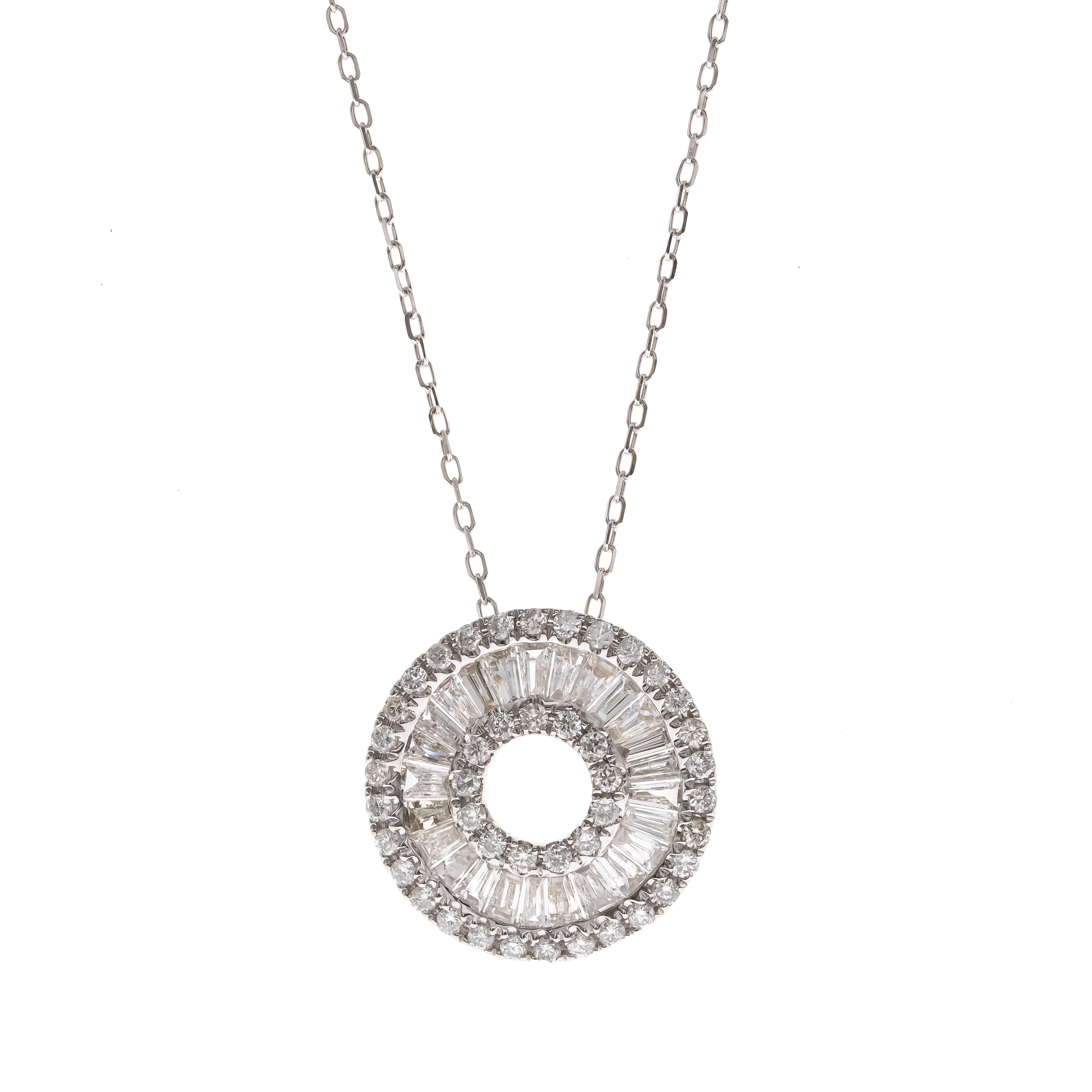Decorate yourself in elegance with this Pendant is crafted from 14-karat White Gold by Gin & Grace. This Pendant is Baguette-Cut white diamond (21 Pcs) 0.62 carat and round-cut White Diamond (43 Pcs) 0.28 Carat. This Pendant is weight 2.85 Grams. This delicate Pendant is polished to a high finish shine.