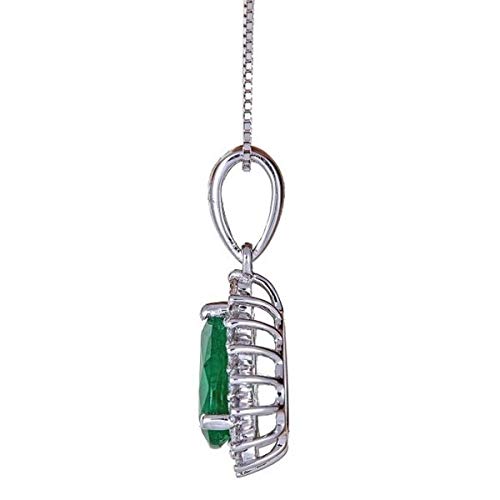 This beautifully crafted Gin & Grace Natural Emerald necklace showcases a Pear-Cut center Natural Zambian Emerald surrounded by a halo of brilliant diamonds. The pendant hangs from an 18-inch box chain that secures with a spring-ring clasp. Style: Pendant Gemstone colors: Green Gemstone shapes: Pear One prong-set Pear-cut Zambian Emerald measure 6 mm wide x 8 mm long Total gemstone weight: 1.0 carat Diamonds: 16 Diamond cut: Round-cut measure 1 mm Diamond weight: 0.21 carat Color: G-H Clarity: I1-I2 Setting: Prong Metal: 18k White gold Finish: High polish Chain: Box Chain length: 1 mm wide x 18 inches long Clasp: Spring ring Metal weight: 1.0 grams Pendant dimensions: 8 mm wide x 16 mm long x 5 mm deep
