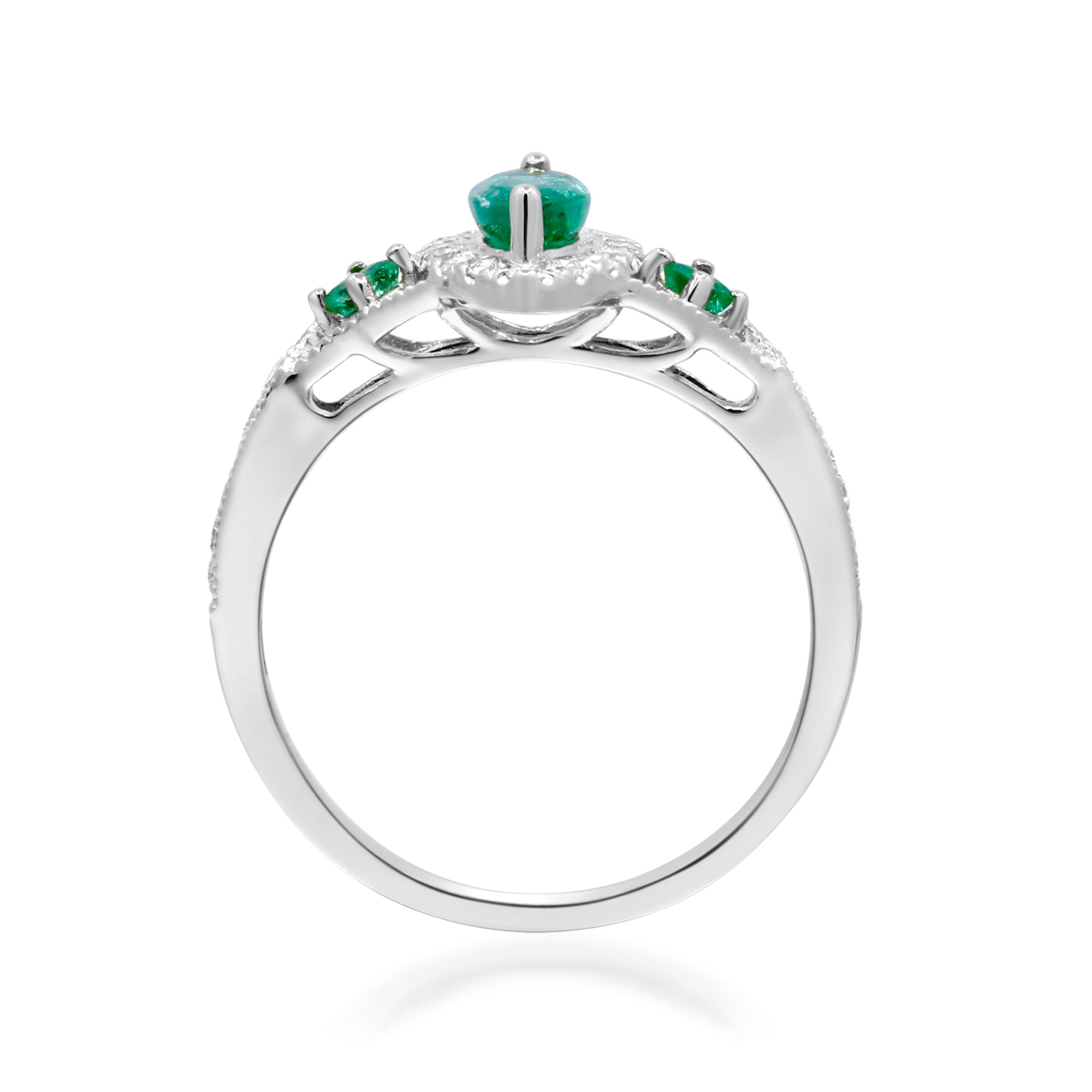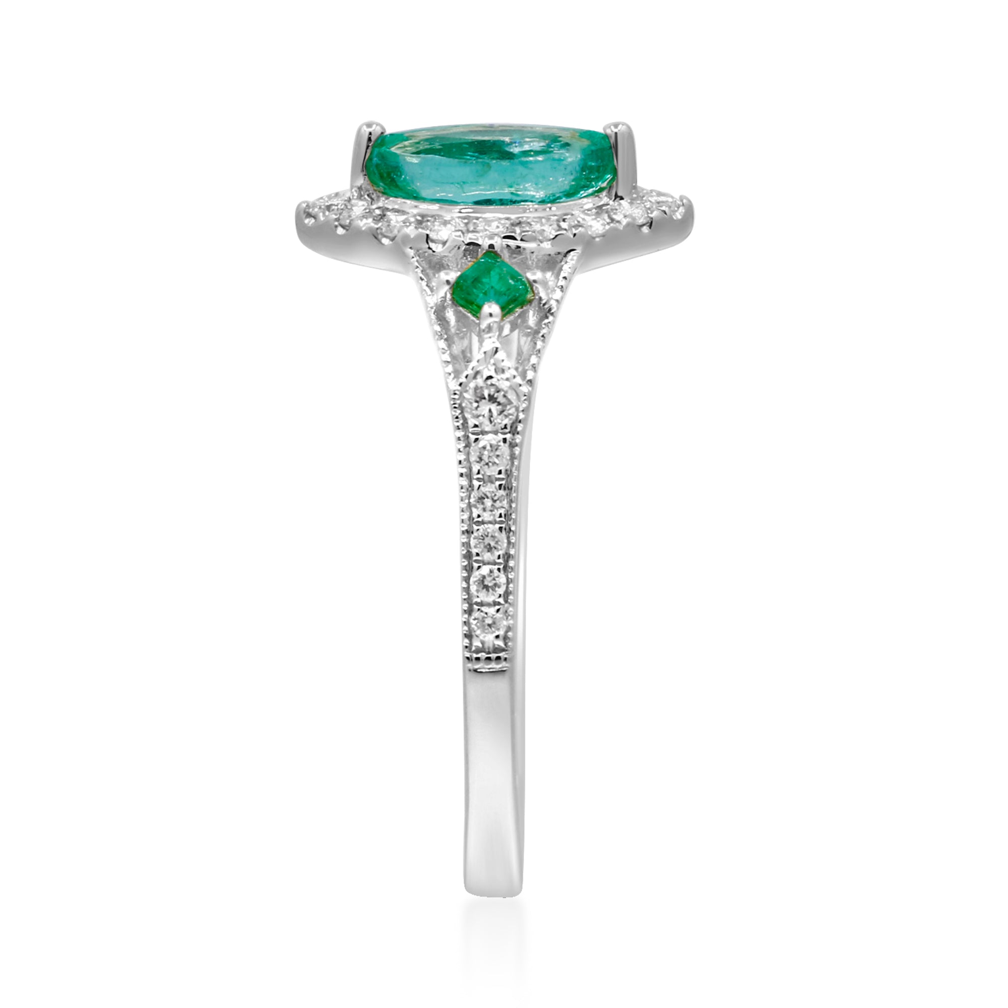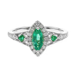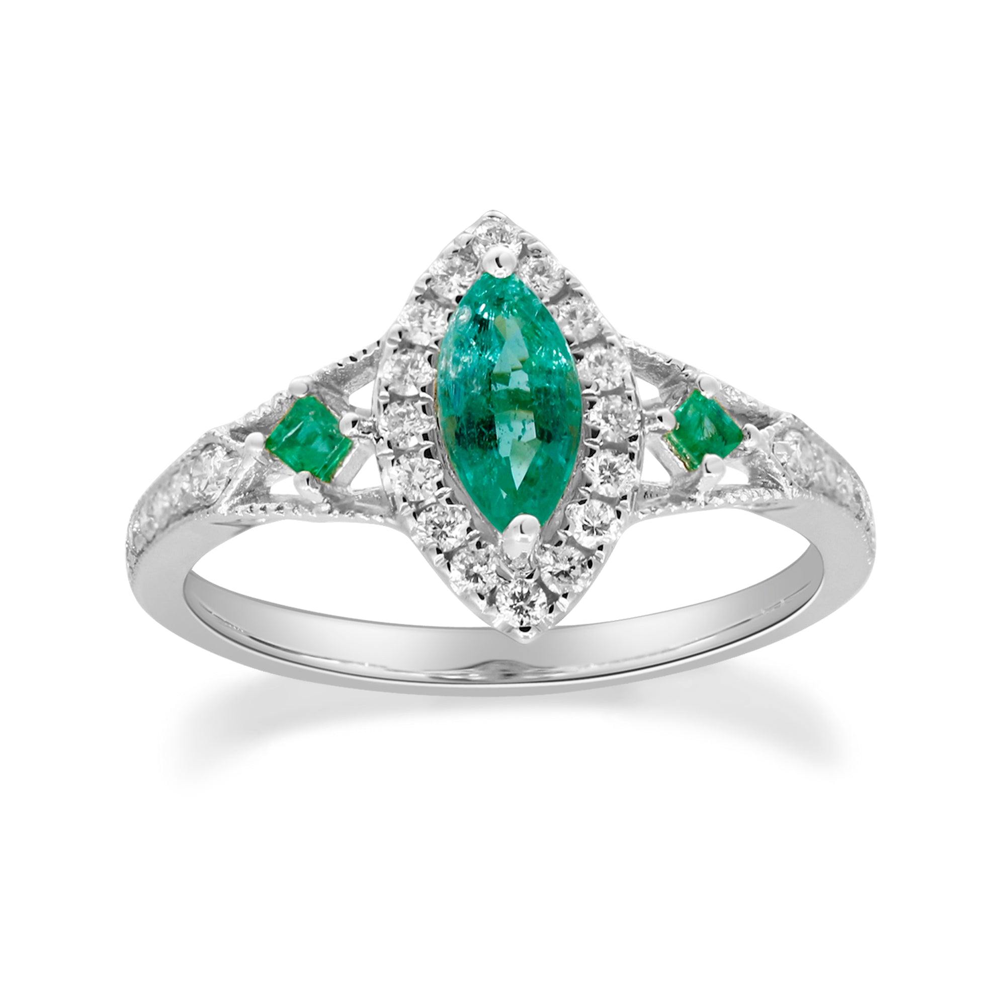 Adding to the allure of the ring are two square-cut Zambian Emeralds measuring 2.0 mm each, with a total weight of 0.11 carats. These Zambian Emeralds complement the marquise-cut stone beautifully and create a harmonious composition. Additionally, 28 round-cut white diamonds with a total weight of 0.25 carats adorn the ring, providing a brilliant sparkle and enhancing its overall elegance.