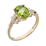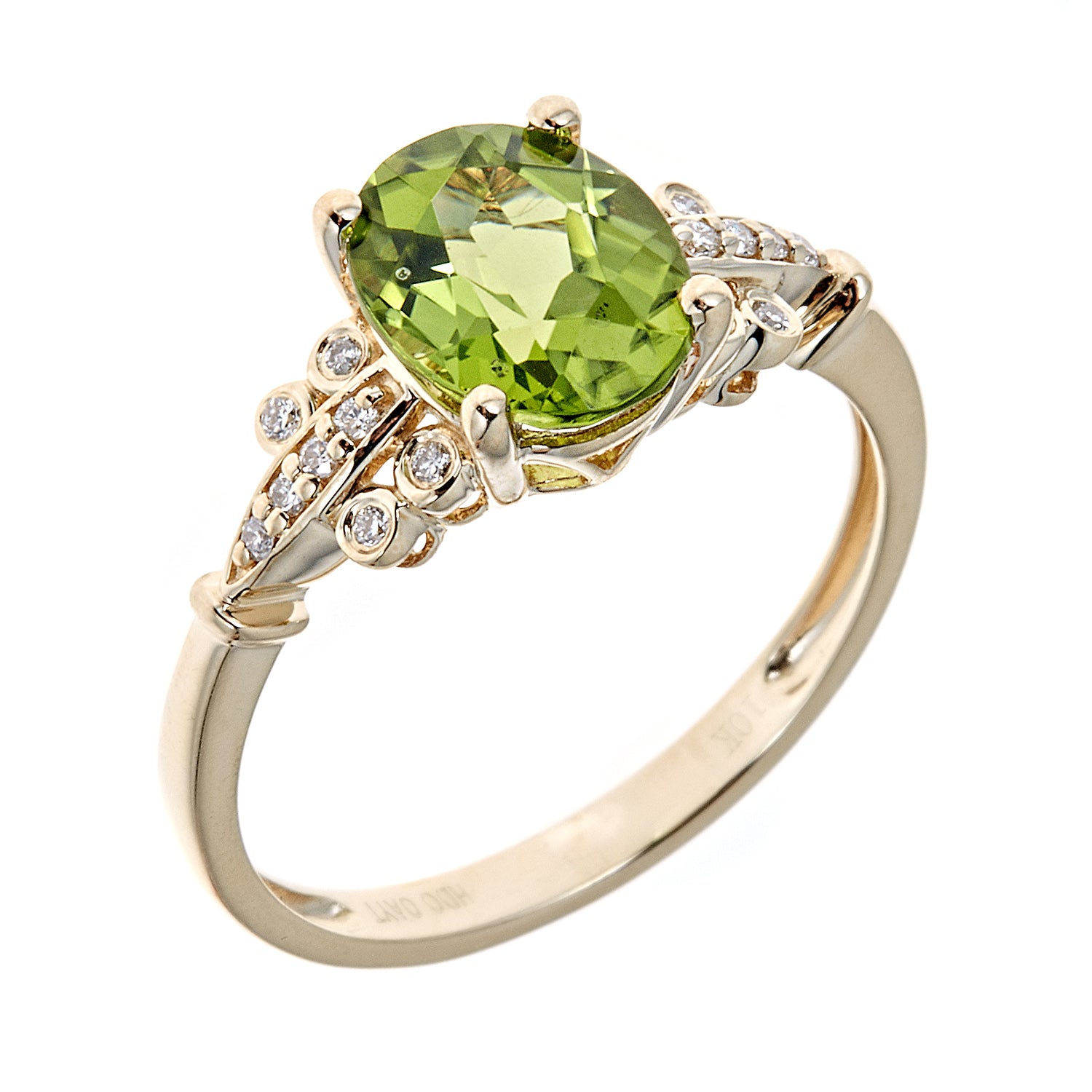 Stunning, timeless and classy eternity Unique ring. Decorate yourself in luxury with this Gin & Grace ring. This ring is made up of 7X9 mm Oval-Cut Prong Setting Genuine Manchurian Peridot (1 pcs) 2.0 Carat and Round-Cut Prong Setting Natural Diamond (16 pcs) 0.08 Carat accent stones for a lovely design. This ring is weight 2.10 grams. The ring is crafted of shining 10-karat Yellow Gold and is completed by a highly polished finish..