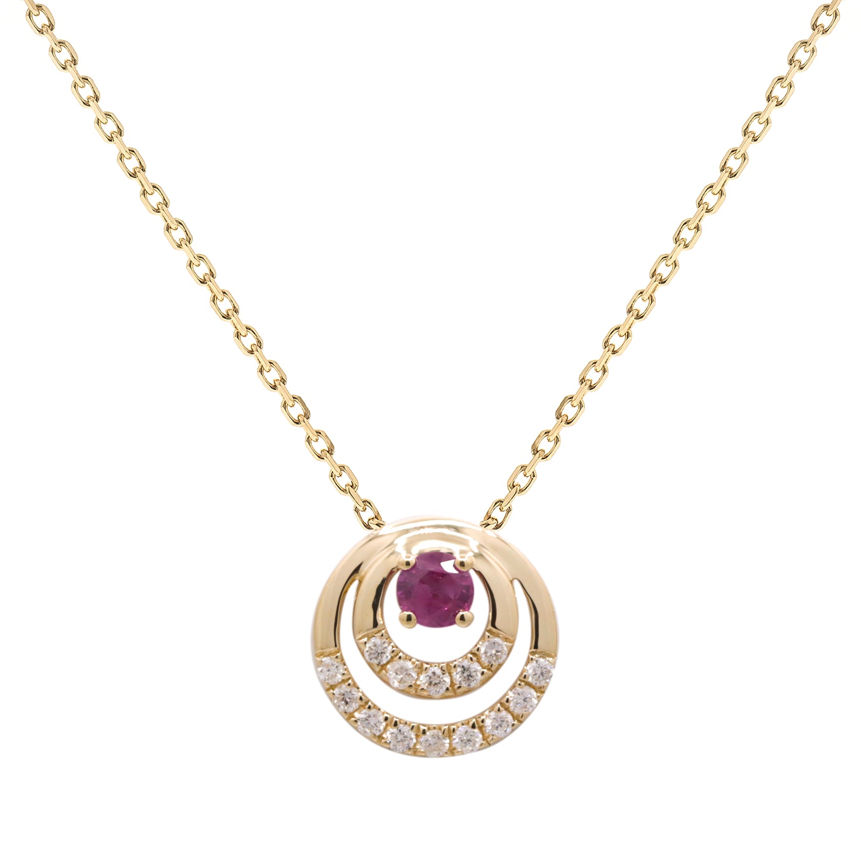 Stunning, timeless and classy eternity Unique Pendant. Decorate yourself in luxury with this Gin & Grace Pendant. This Pendant is made up of Round-Cut Prong Setting Genuine Mozambique Ruby (1 pc) 0.15 Carat and Round-Cut Prong Setting Natural Diamond (14 pcs) 0.11 Carat accent stones for a lovely design. This pendant is weight 1.62 grams. The pendant is crafted of shining 14-karat Yellow Gold and is completed by a highly polished finish.